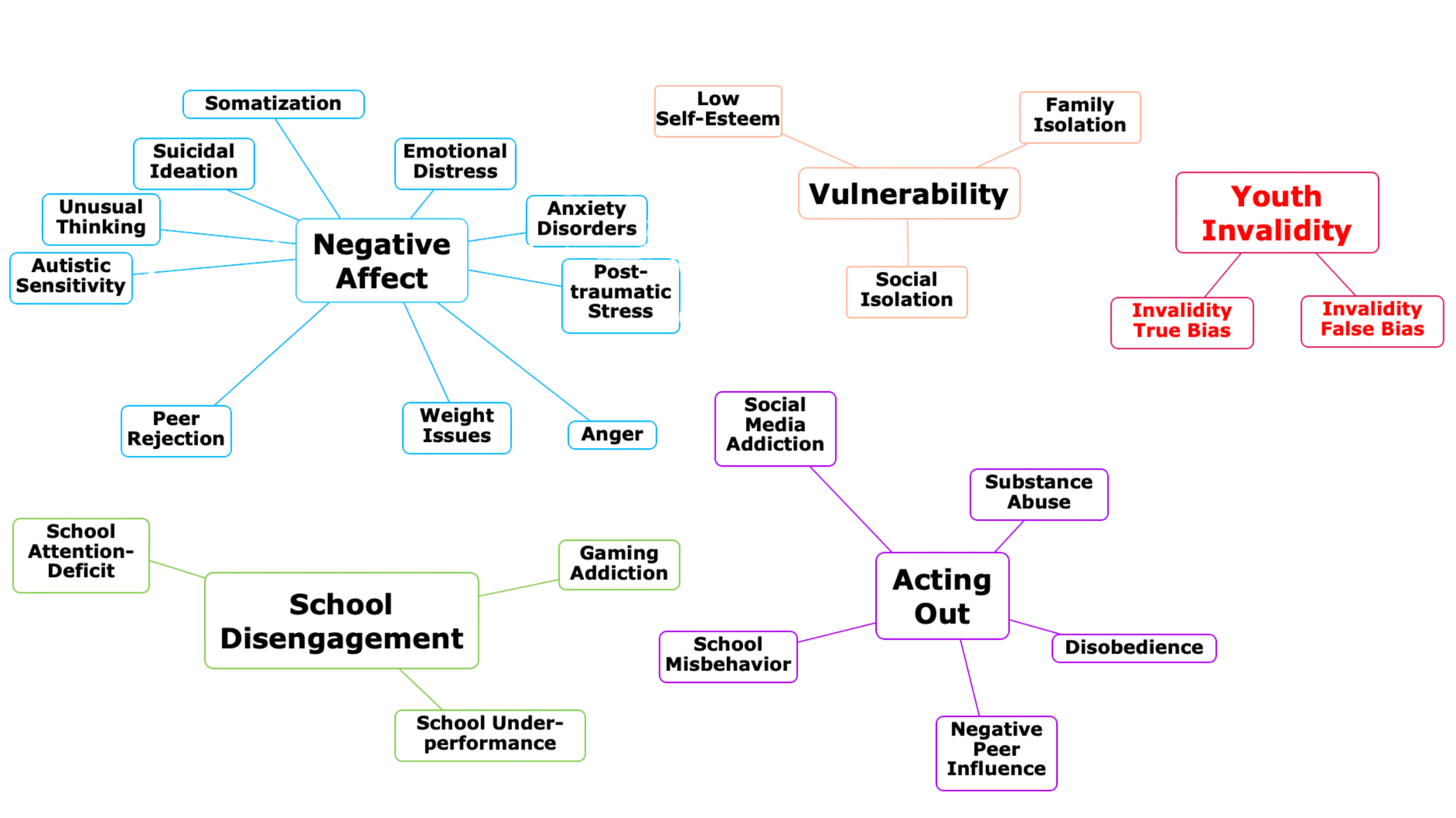 Resiliency: Identifies potential risk factors such as low self-esteem, social exclusion, and family isolation.