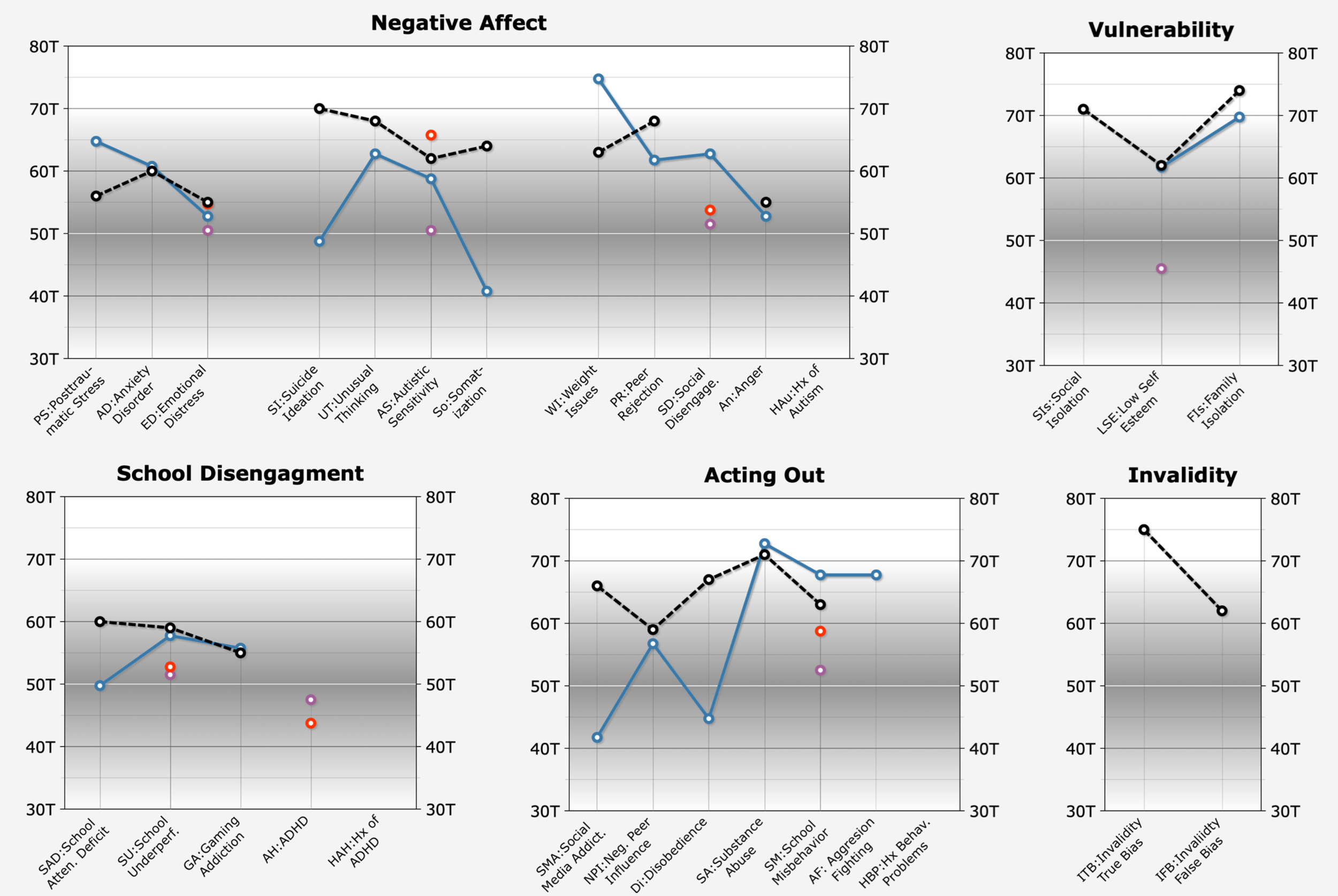The MIASA also offers T-score graphs normed on contemporary community samples that reflect population base rates for mental health problems.